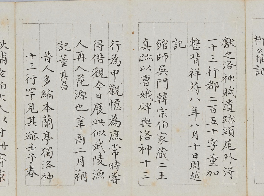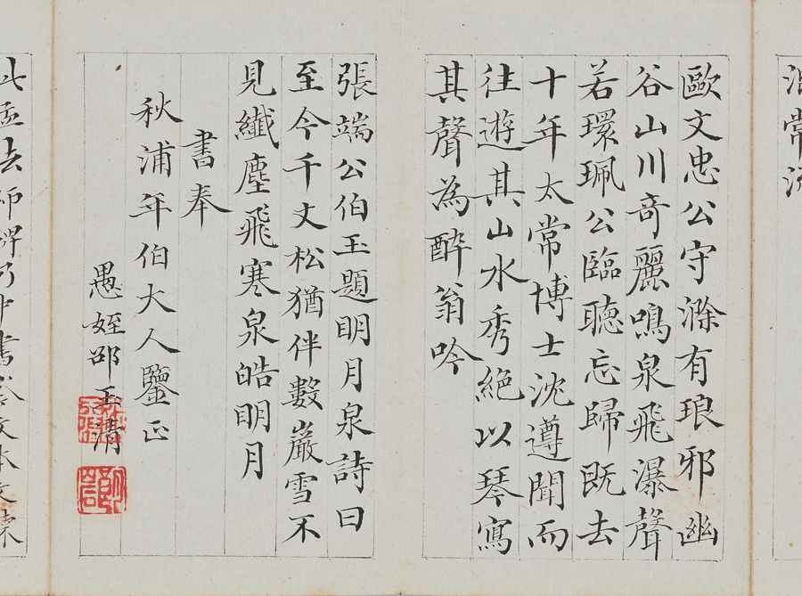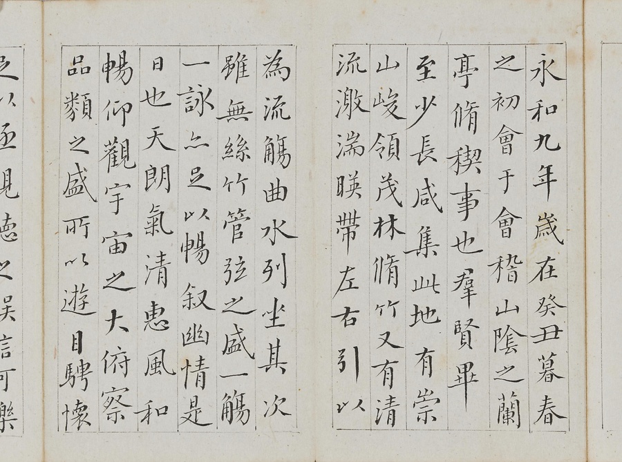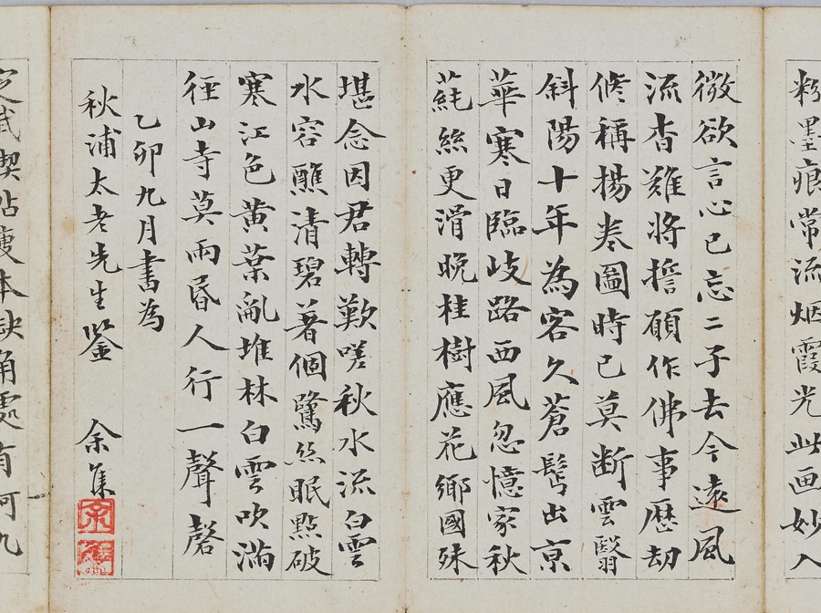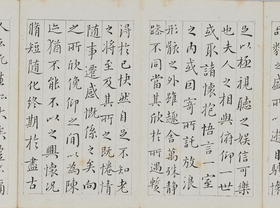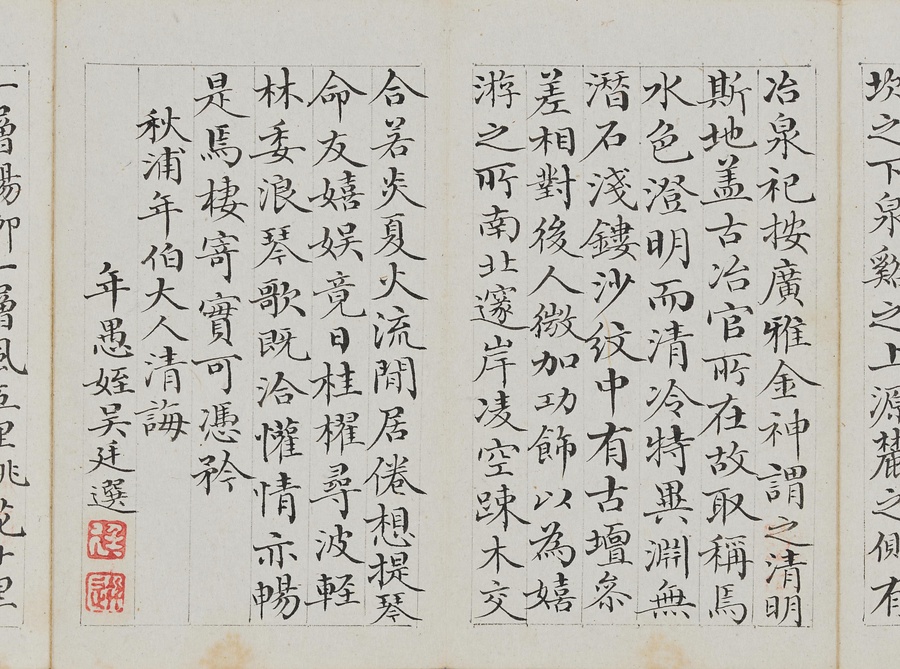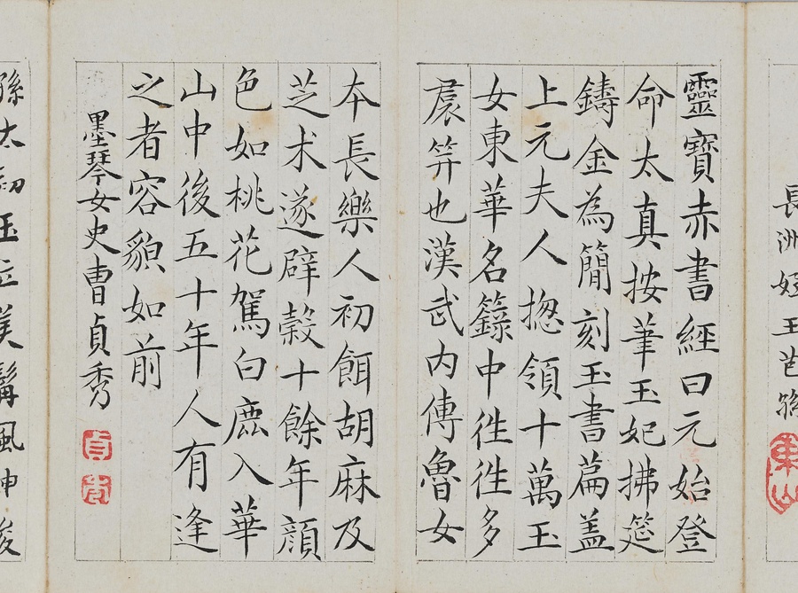 乾隆@けんりゅう@期の文人23名が秋浦@しゅうほ@という者のために、碑帖の臨書や様々な文章を書き継いだ1帖。蠅@はえ@の頭のような極小の書で、印も特製でしょう。学界の重鎮の翁方綱は縮小臨書の蘭亭序@らんていじょ@とその刻石に関する文章を記し、能書@のうしょ@の伊秉綬@いへいじゅ@は王羲之@おうぎし@ら晋唐名家の法帖を臨書します。碑帖は文人の交流に欠かせないものだったのです。