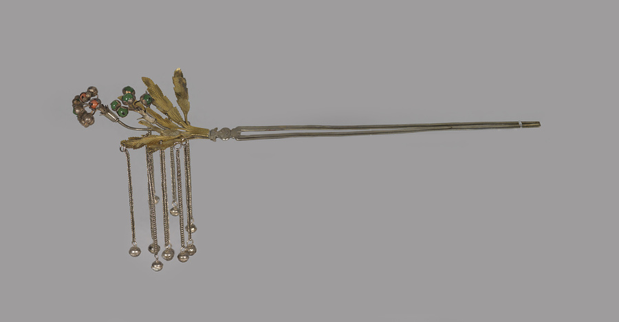 銀製小町琴柱形の簪にに茱萸袋の飾りを付けた歩揺簪で一対(188と189)で伝わる。茱萸袋は重陽の節句で茱萸を袋に入れて飾ったもので、銀製毛彫で袋を表し、茱萸の葉は金銅製、実は珊瑚玉と緑のガラス玉で表している。銀鎖の先に銀鈴を付けた歩揺が下がる。歩揺簪は寛政年間に流行し、鎖の先に蝶や鳥・小鈴などを付けて、歩くたびに揺れ動いて音がするようにしたもので、主に上流階級で用いられて華美を極めた。文化・文政頃に江戸で廃れ、その後上方でも廃れて文久頃には全く絶えたとされるが、実際には近年まで作られ、使用されていた。花柳章太郎(1894~1965)の旧蔵品で平成15年(2003)に遺族の青山久仁子氏より国立劇場へ寄贈された。