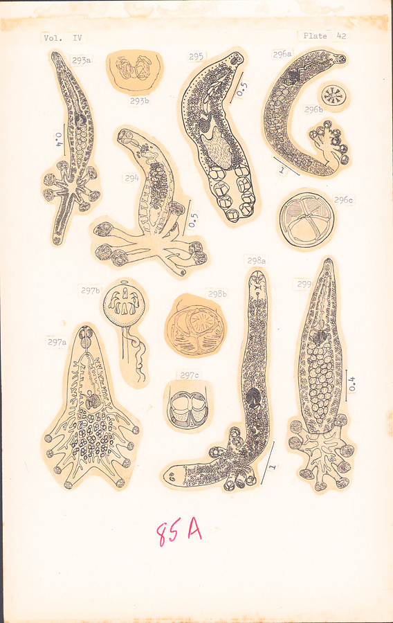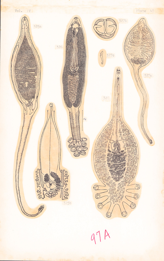 Fig. 332a–b. Indocotyle hemirharnphi Tripathi, 1959 (a), and clamp (b).