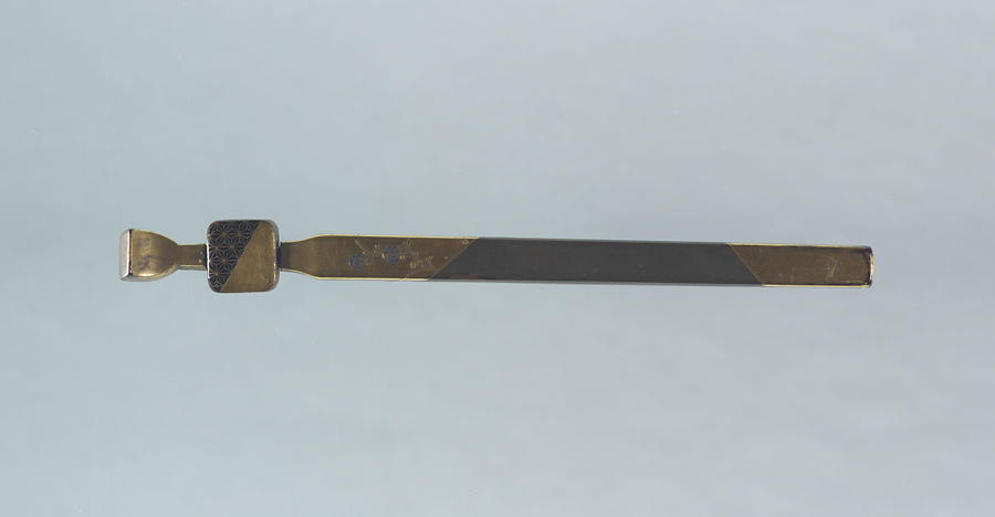 木製漆塗で、角耳、頭付、一本足の簪で、立差か中差として使用されたと考えられる。耳掻と胴の両端を金粉溜地として菊に蝶を高蒔絵とし、中間を片身替で錫粉溜地とする。頭は黒漆塗に麻葉繋文の平蒔絵と金粉溜地を片身替としている。花柳章太郎(1894~1965)の旧蔵品で平成15年(2003)に遺族の青山久仁子氏より国立劇場へ寄贈された。