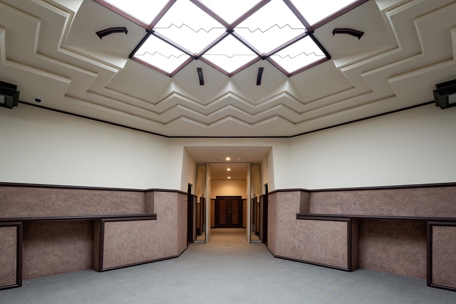 東京拘置所内に位置する刑務所庁舎。関東大震災の後、司法省技師の蒲原重雄が設計を担い、昭和4年に竣工した。行刑思想の転換を反映し、庁舎の正面を塀外に現すことで、外部に開かれた刑務所庁舎を実現した。水平に広がりをみせる鉄筋コンクリート造の駆体は中央に塔屋が屹立し、翼を広げた鳥を想起させる外観。直線や折線、台形、逆台形など幾何学的な意匠で構成された内外装を含め、同時代の建築において傑出した独創性を示す。夭折した蒲原の希少な作品であり、大正末から昭和初期に流行し、自由な造形表現を目指した、我が国における表現主義建築の掉尾を飾る建築として重要である。