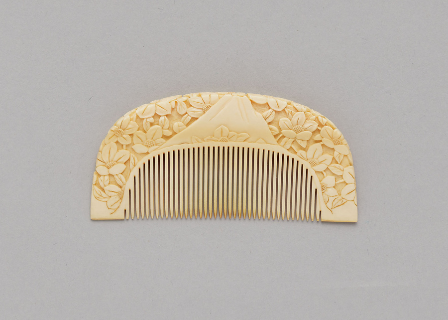 象牙製、政子形の挿櫛で、富士見業平に椿を高彫りで表している。政子形の櫛は、安永頃に江戸の南伝馬町3丁目鼈甲職・駿河屋六左衛門が鶴岡八幡宮の什宝「菊籬蒔絵螺鈿手箱」(政子の手箱)の内に納められる櫛の形に倣って作り始めたとされる。花柳章太郎(1894~1965)の旧蔵品で平成15年(2003)に遺族の青山久仁子氏より国立劇場へ寄贈された。