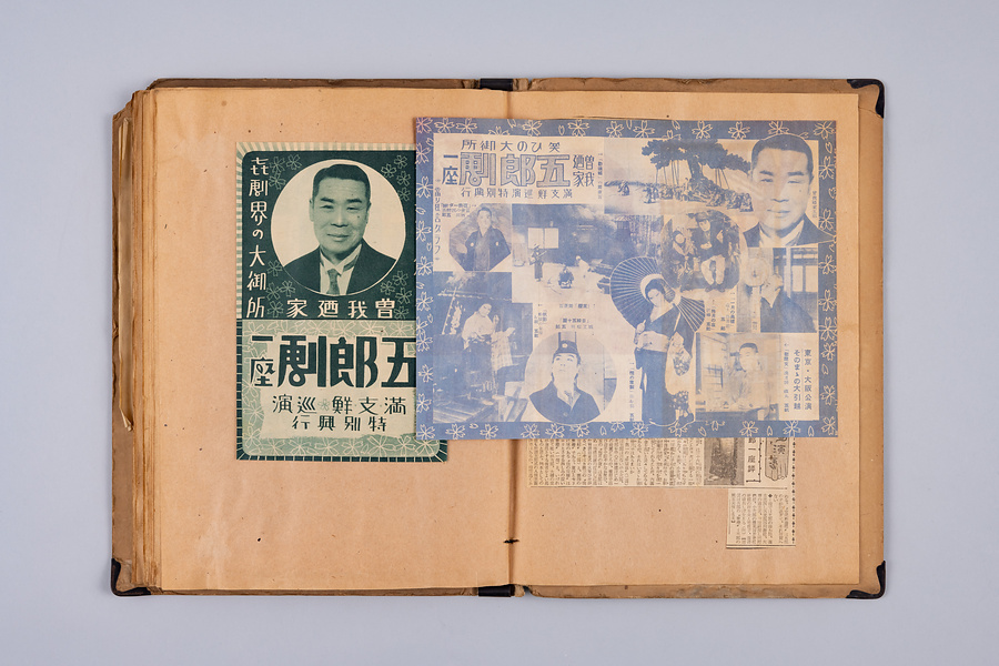 茶のボール紙製の表表紙に「切抜 自 昭和十五年三月興行 至 十六年五月興行」と書かれている。昭和15年(1940)3月に行われた「満支鮮巡演公演」(満州、中華民国、朝鮮の三カ国巡演公演)のチラシや、同年10月の大日本俳優協会の発足を伝える新聞記事等も貼られている。明治42年(1909)年に結成された大日本俳優協会は歌舞伎俳優の組合だったが、このとき発足した大日本俳優協会では新派や喜劇の俳優も加わった。五郎は監事の末席に連なったことをことのほか喜んでいたようだ。