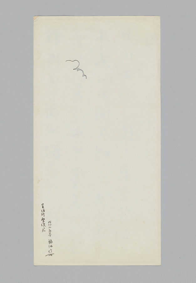昭和4年(1929)春、河竹繁俊が福地信世より「預か」ったもの。信世は福地桜痴の長男であり、地質学者として東京帝大の教壇に立つ傍ら、舞踊作家としても活躍した。桜痴の筆で「桂櫂兮蘭枻 斲冰兮積雪 采薜茘兮水中 搴芙蓉兮木末 心不同兮媒勞 恩不甚兮輕絶 石瀬兮淺々 飛龍兮翩々 桜痴居士源」とある。「源」は桜痴の本名・源一郎にちなむか。内容は儒教の経典とも、祭神歌舞の詩とも解釈されてきた『楚辞』「九歌」の一部である。