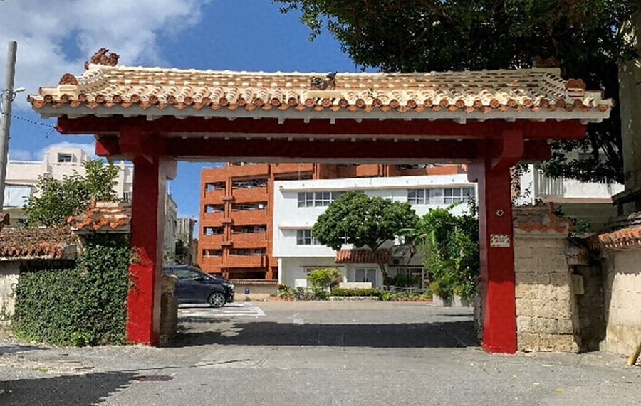道路から敷地に至る通路にあるホテル表門。一間腕木門形式で鉄筋コンクリート造の角柱上部に腕木を挿し軒桁を受ける。屋根は切妻造琉球赤瓦葺で両妻に降棟をつけ大棟には鬼瓦を据える。沖縄の伝統建築の意匠で、戦後沖縄を代表するホテル入口を飾る大道門。