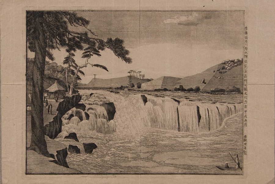 亜欧堂田善が、文化11年(1814)、須賀川(福島県須賀川市)の俳人たちによる俳諧集『青蔭集』の挿絵として製作された銅版画。画面左に小さく松尾芭蕉(まつおばしょう)の石碑が描かれ、画面中央に現在の須賀川市と玉川村の境にある乙字ケ滝が描かれる。この銅版画は挿絵として見開きで掲載されたため、半裁されたものが多いが、当資料は一枚ものとして伝来した貴重な作品。