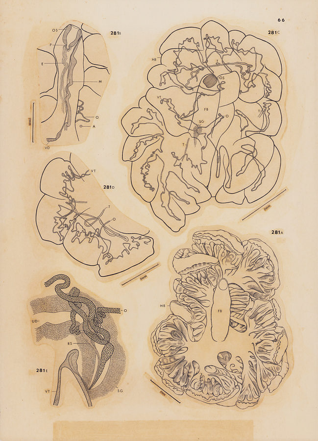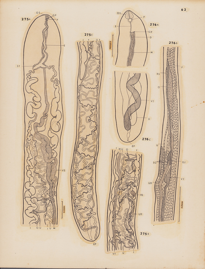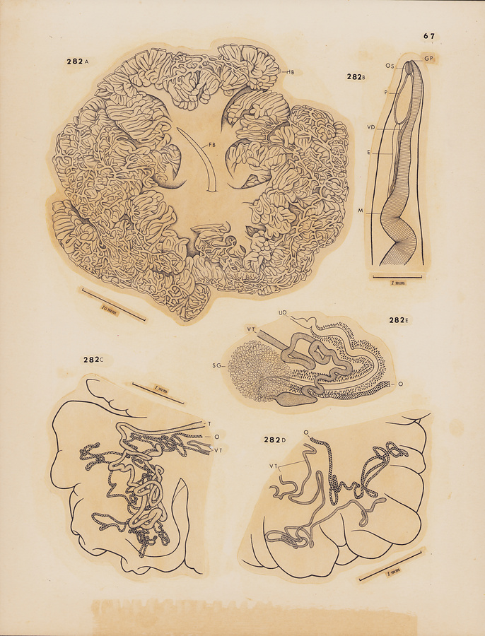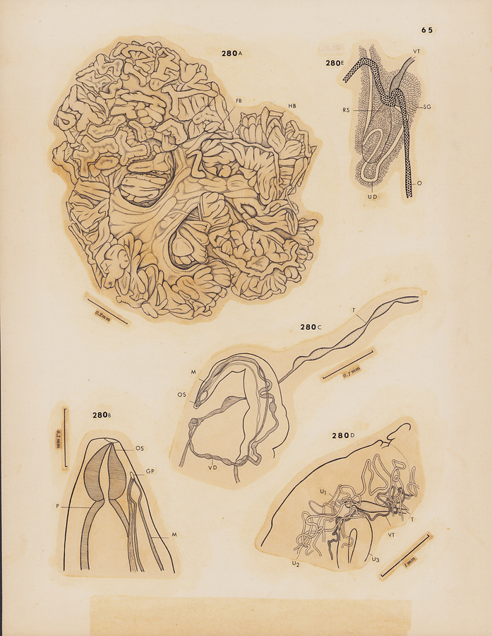 Fig.282 Neodidymozooides microstoma n. g., n. sp. A, sketch of entire body of paratype, ventral view; B, anterior extremity of paratype, lateral view; C, peripheral part of hindbody of holotype, showing testis, ovary and vitelline gland, ventral view; D, peripheral part of hindbody of holotype, showing ovary and vitelline gland only; E, region of genital junction paratype, ventral view.