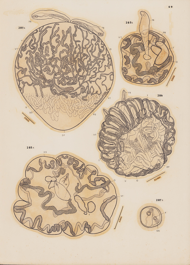 Fig.287 Pseudocolocyntotrema yaito n. g., n. sp. A, holotype, lateral view; B, ventral hollow of hindbody, enclosing two forebodies, end-on view.