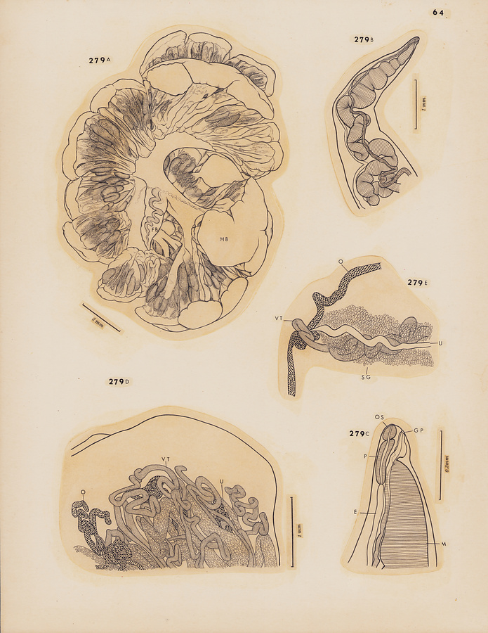 Fig.279 Maccallumtrema xiphiados (G. A. et W. G. MacCallum, 1916) n. comb. A, sketch of entire worm, ventral view; B, anterior extremity of forebody, ventral view; C, same, enlarged; D, part of terminal lobe of hindbody, ventral view; E, genital junction, ventral view.