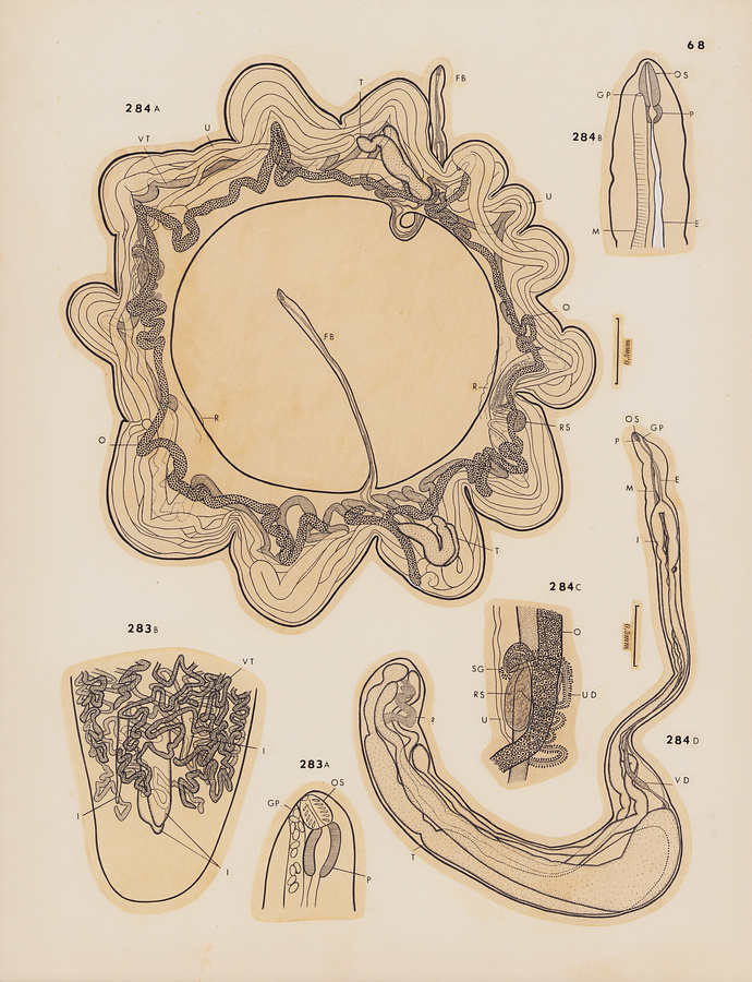 Fig.284 Annulocystis auxis n. g., n. sp. A, holotype, largely ventral view; B, anterior extremity of holotype, ventral view; C, genital junction of holotype, lateral view; D, isolated, predominantly male specimen, largely lateral view.