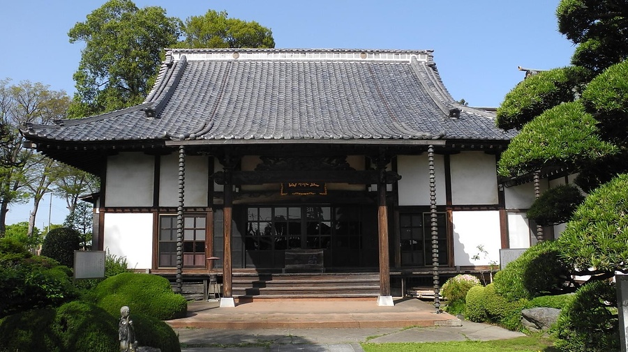 市街地北東に位置する浄土宗寺院の本堂。境内東寄りに西面して建つ入母屋造桟瓦葺で、正面に一間向拝を付す。平面は前方を外陣、後方中央を内陣、両側を脇陣とし、内陣に禅宗様須弥壇を配し、格天井に草花の彩色画を華やかに飾る。境内景観の中核をなす本堂。