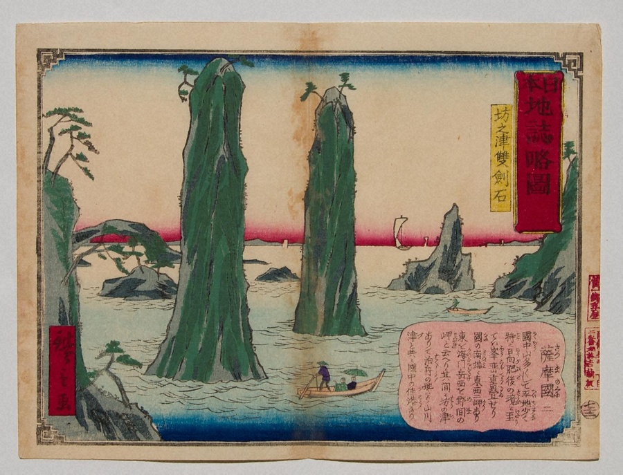 作者は、初代広重門下で主に明治維新後に活躍した、三代広重。「日本地誌略図」は全国の名所を扱った74枚の揃物で、本コレクションには西日本の25種を所収している。備後国については、初代広重の「六十余州名所図会」の図(№431)とほぼ同じ構図で、阿伏兎観音を描いている。