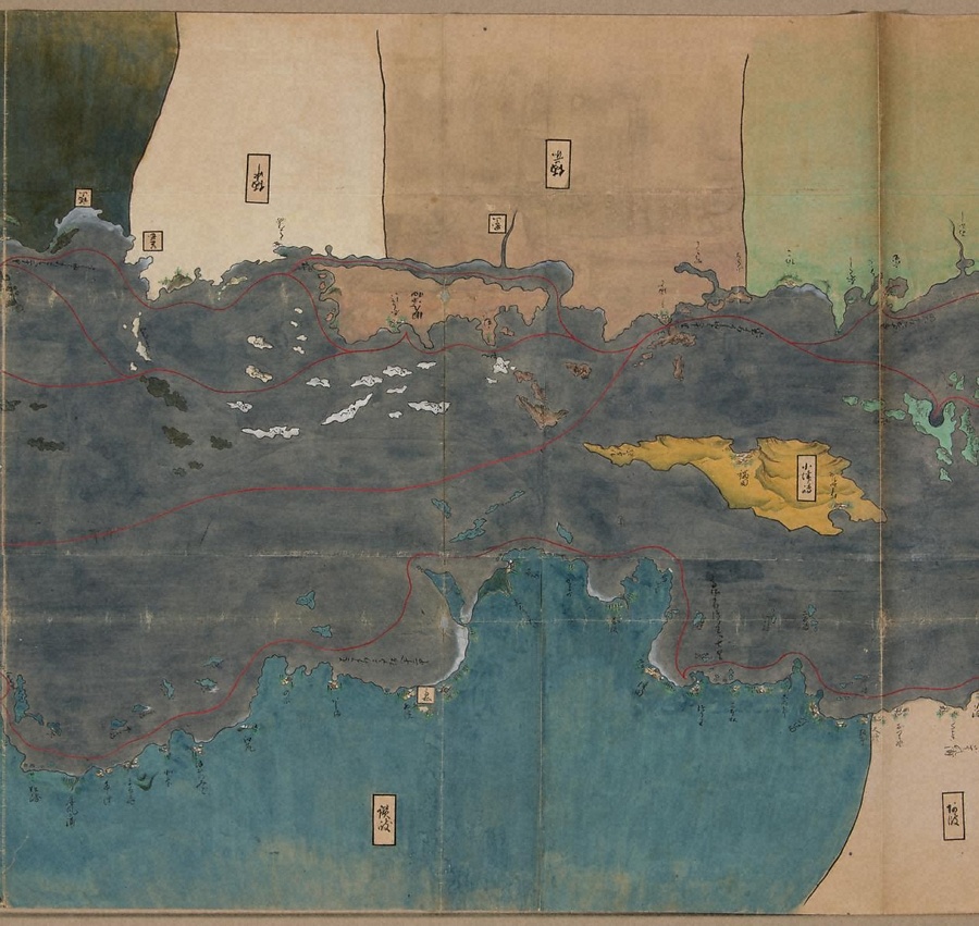 本図は、大坂からの瀬戸内海航路と、そこからさらに鹿児島に至る九州沿岸の航路が描かれる。陸地の図形は大きくゆがめられる一方で、航路については詳細に描かれる点から、陸からの視点ではなく、海からの視点で描かれた実用的な航海図とみられる。現在は巻子装になっているが、本来は畳物であった。資料名は表紙の題箋から。