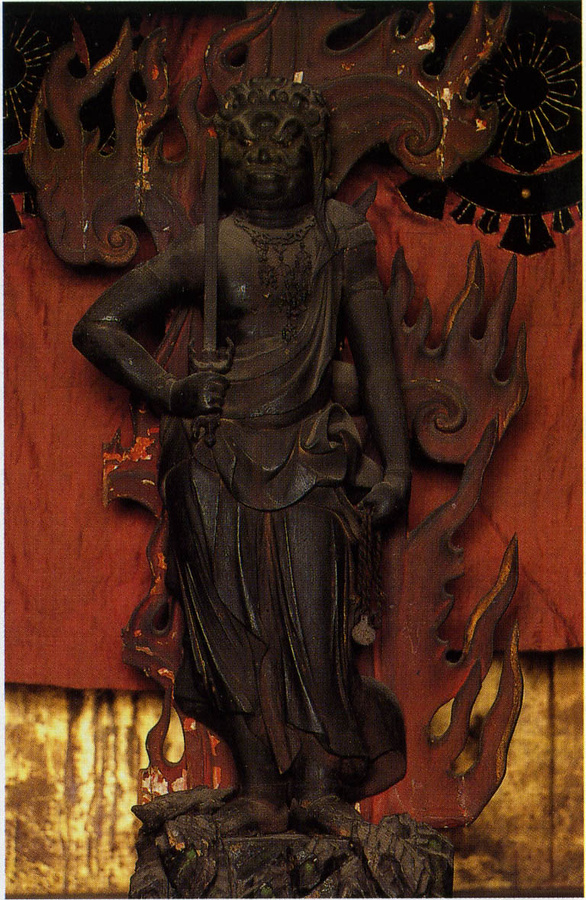 大日如来の化身で破邪顕正(けんじゃく)をおこなう不動明王は、童顔で額にしわがあり、頭髪を左肩に垂らし、右手に宝剣と左手に羂索を持っており、この像は忿怒の相を見事に表現している。しかし、通常は脇士として勢多迦(せいたか)童子と金迦羅(こんがら)童子を侍せているが、この像にはない。光炎は後世のものである。