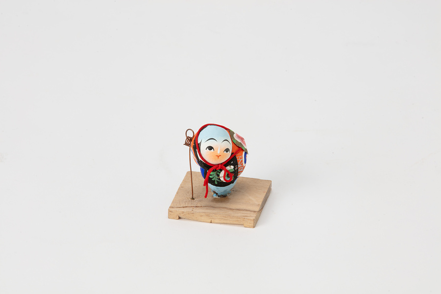昭和9年(1934)に考案された「かすみ人形」のうち、田螺の殻を利用して作られた「たにし人形」で、「金棒引き」。祭礼の半纏をまとい、背中の「祭」という文字が目を引く。