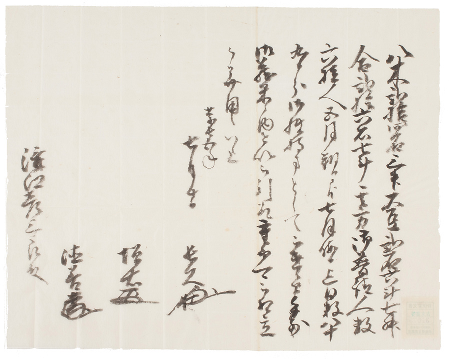 江戸時代後期に彦根藩士溝江彦之右衛門家から藩に提出された同家伝来文書の写。普請人数六十人の八十九日分扶持米として米二十四石三升、大豆二石六斗七升を手前蔵米の内より引き取り、算用を立てるようにと、前田玄以・増田長盛・長束正家が連署して命じています。