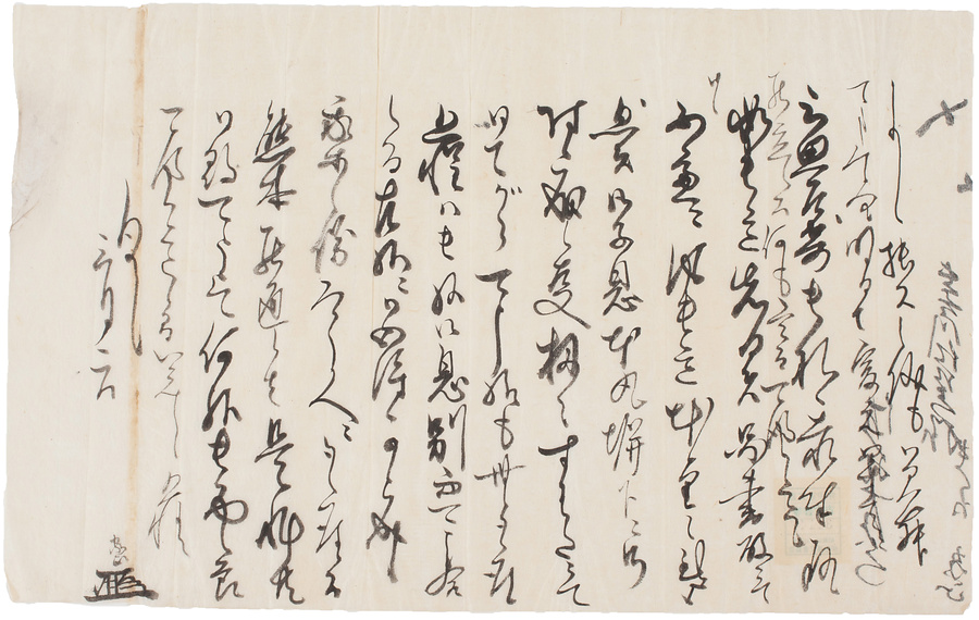彦根藩士本多七左衛門家から藩に提出された文書類の写の一つ。水野日向守(勝成)の家臣佐野家正から長谷川仁左衛門へ宛てられた書状の写し。本資料では、島原の乱において、長谷川仁左衛門の子息(長谷川太郎助)が本丸の塀下に取り付いて、手柄を挙げたことを伝え、自分たちはその証人となるので、熊本を通行する際に尋ねて欲しいと述べています。