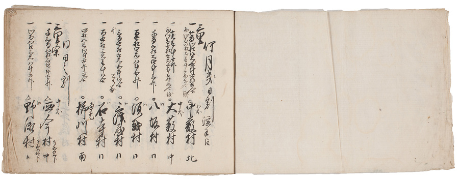彦根藩井伊家の歴代藩主は、治世の初期の彦根在国中に領内の巡見を行いました。本資料は、藩領の「北筋」(天野川(米原市)より北の地域)を巡見する際の道割、道中の村々高、宿泊場所などを書き出したものです。
