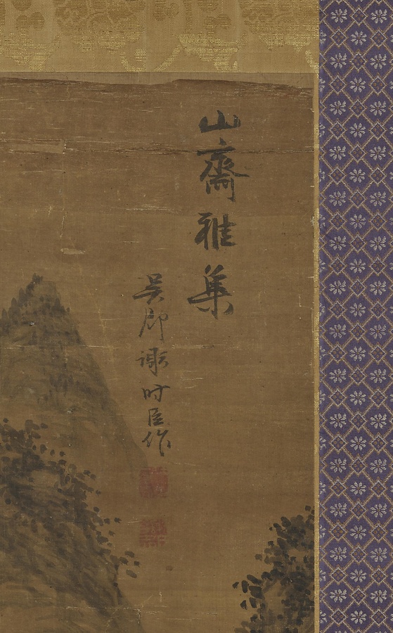 謝時臣【しゃじしん】ははじめ沈周【しんしゅう】に画を学び、文徴明らと交遊のあった文人画家です。書は特に隷書を善くしました。画は山水に長じ、当時、蘇州に流行していた呉派【ごは】の流れを承けるものの、浙派【せっぱ】の戴震【たいしん】や呉偉【ごい】の影響も承け、独自の画風を創出しました。(20160720_t08橋本コレクション)