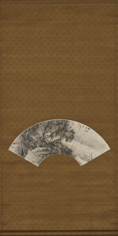 宋登春(号は海翁)は新河@しんか@(河北省)出身の詩人で画家としても活躍したと伝わりますが、現存作例に乏しくその実態はよくわかっていません。風に葉の茂みをゆらす林に入っていこうとする高士二人を描く本作には、「海翁」と読める落款があり、近代の篆刻家桑名鉄城@くわなてつじょう@により、宋登春の作と鑑定されています。