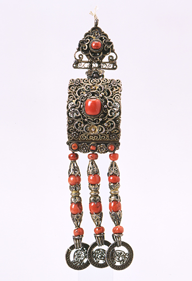 ディアデマのような鉢巻き状の頭飾りに付ける装飾品です。ちょうどこめかみのあたりに吊り下げます。この資料のように銀線細工に貴石や珊瑚を組み合わせた例が知られています。