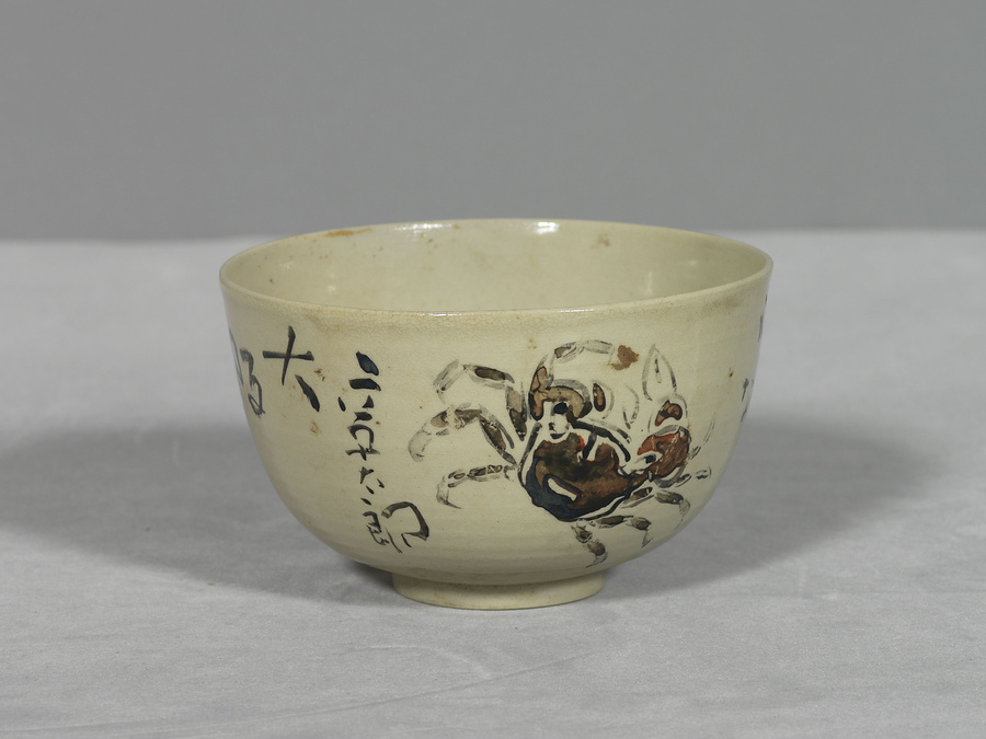 抹茶碗に花柳章太郎の自筆で「大阪は 打水多き 桔梗かな 章太郎」の句と蟹の絵が描かれる。章太郎は若い頃から巡業で大阪をよく訪れており、在阪時の経験を記した随筆も多い。