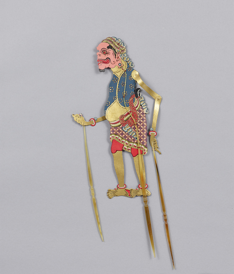インドネシアの伝統的な影絵芝居ワヤン・クリで用いる人形。スイギュウの革を切り抜いて透彫し、金彩と彩色の後に、可動部分をつなぎ、水牛の角製の棒をつけたもの。人形遣いダランが多数の人形を一人で操りつつ台詞を語り、観客は白幕に写った影も、ダランが人形を操るさまも、自由に鑑賞できる。この人形は、民族造形学者・金子量重氏が収集した、『ラーマーヤナ』を上演するための一そろいのワヤン・クリのうち1体。