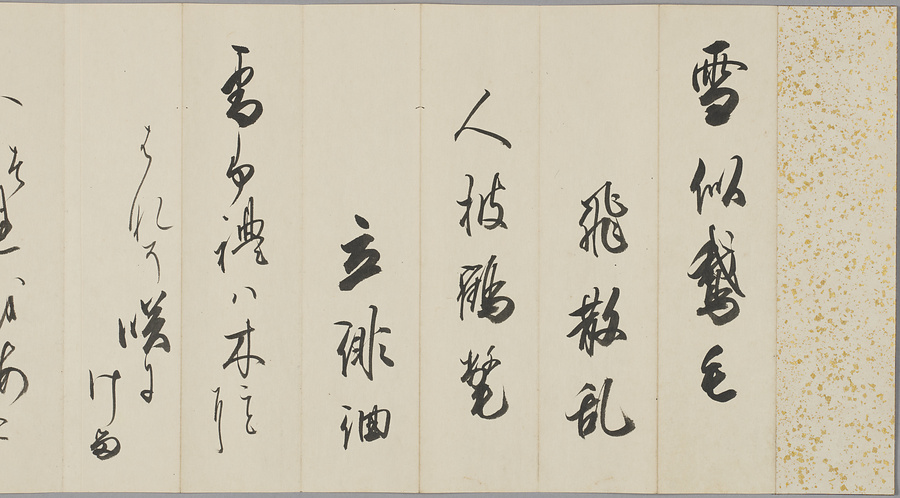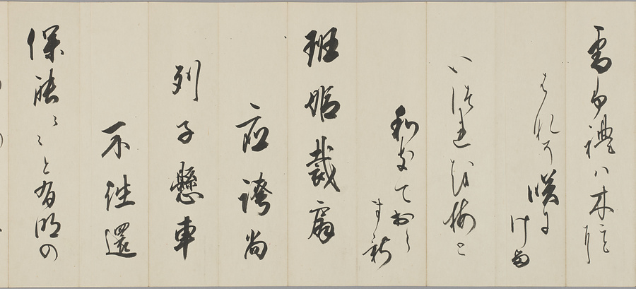 有栖川宮職仁(よりひと)親王(1713-69)が『和漢朗詠集』所収の漢詩と和歌を書写したもの。職仁親王は、霊元天皇の第17皇子で、後西天皇の孫の正仁(ただひと)親王が嗣子なく薨じたことをうけ、有栖川宮家を継承した。歌道に優れたほか、父・霊元天皇の書風を受け継ぎ、有栖川流を創始した。