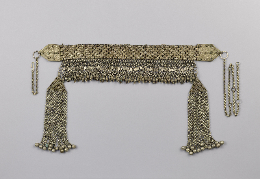 アラビア半島の南西端、紅海とアデン海に囲まれたイエメンでは、古くから銀製の装身具が盛んに制作されてきた。特に18世紀から20世紀前半にかけては、当地に居住していたユダヤ系の銀細工師によって銀細工の制作を独占した。彼らは、銀もしくはスターリング・シルバーのような銀と銅の合金を素材に様々な装身具を制作していた。本品もそうした当地の銀細工の伝統に連なる作品である。イエメンを含む紅海沿岸地域や東アフリカ一帯では、オスマン・トルコをはじめとする東方との貿易を目的にオーストリアで発行された銀貨(レヴァント・ターレル、通称マリア・テレジア銀貨)が200年もの長きにわたり広域地域の決済通貨として機能していたことで知られるが、一部は銀細工の素材としても用いられていた。特に、銀の産出が殆どないイエメンにあって、貨幣そのものをインゴットとして扱い、本品のような銀細工製品の生産が行われたことは、金属工芸の多様性を知る上で興味深い事例になると言えよう。