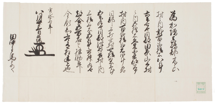 江戸時代後期に彦根藩士田中次郎右衛門から藩に提出された同家伝来文書の写。加増として美作国真島郡木山村・田原山上村、久米北条郡宮部村・上打穴村・津西谷村の内で都合五百石を扶助し領知すべきこと達しています。