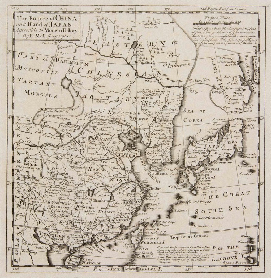 №48と同図で、本資料は彩色なし。イギリスの地図製作者モルの極東図で、北海道は西がシベリアと地続きに描く。北海道の東はデ・フリースの報告に依拠して、「フリース海峡」を挟んで、未知の陸地「カンパニーズ・ランド」を記した。