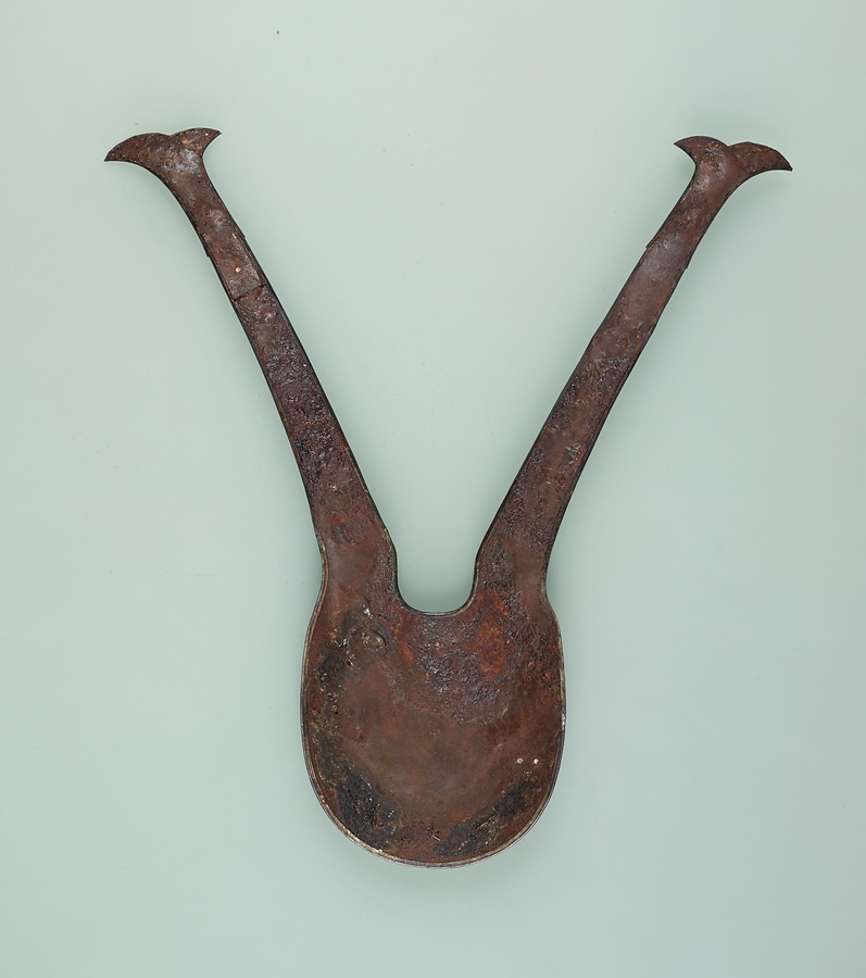 この作品は、アイヌが和人から手に入れたもののひとつで、本州で用いられた、兜の前に立てる飾りである「鍬形」(くわがた)を模したものです。全体を鉄で作り、銀の金具で装飾を施しています。こうした鍬形は、アイヌ語では「ぺラウシトムカムイ」つまり「箆(へら)をお持ちになっている宝の神さま」、あるいは「キラウシトミカムイ」つまり「角(つの)をお持ちになっている宝の神さま」とも呼ばれています。病人の枕元におくことで病気を治し、災いを払うなどの霊力をもつ宝物として用いられました。