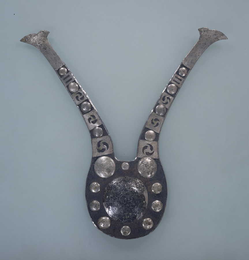 この作品は、アイヌが和人から手に入れたもののひとつで、本州で用いられた、兜の前に立てる飾りである「鍬形」(くわがた)を模したものです。全体を鉄で作り、銀の金具で装飾を施しています。こうした鍬形は、アイヌ語では「ぺラウシトムカムイ」つまり「箆(へら)をお持ちになっている宝の神さま」、あるいは「キラウシトミカムイ」つまり「角(つの)をお持ちになっている宝の神さま」とも呼ばれています。病人の枕元におくことで病気を治し、災いを払うなどの霊力をもつ宝物として用いられました。