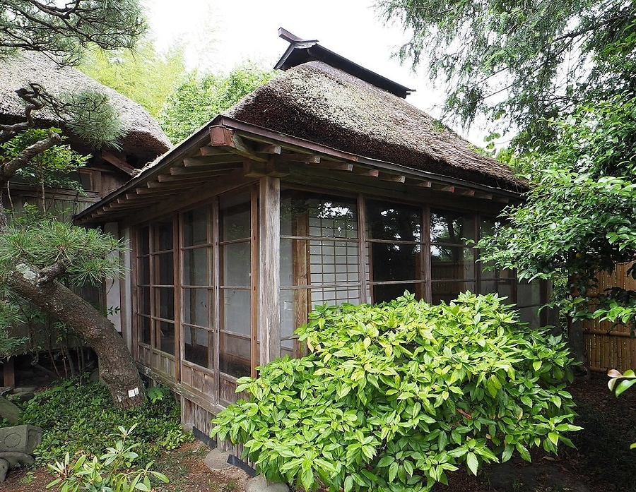 主屋南東に接続する茶室。寄棟造茅葺で南から西に鉄板葺庇を廻らす。内部は6畳1室で、東面南寄りに吊床を設け、西面北寄りに茶道口を開ける。南庭に面した半間幅の縁にガラス戸を建てた開放的なつくりで、茅葺屋根が主屋とともに歴史的景観を形成する茶室。
