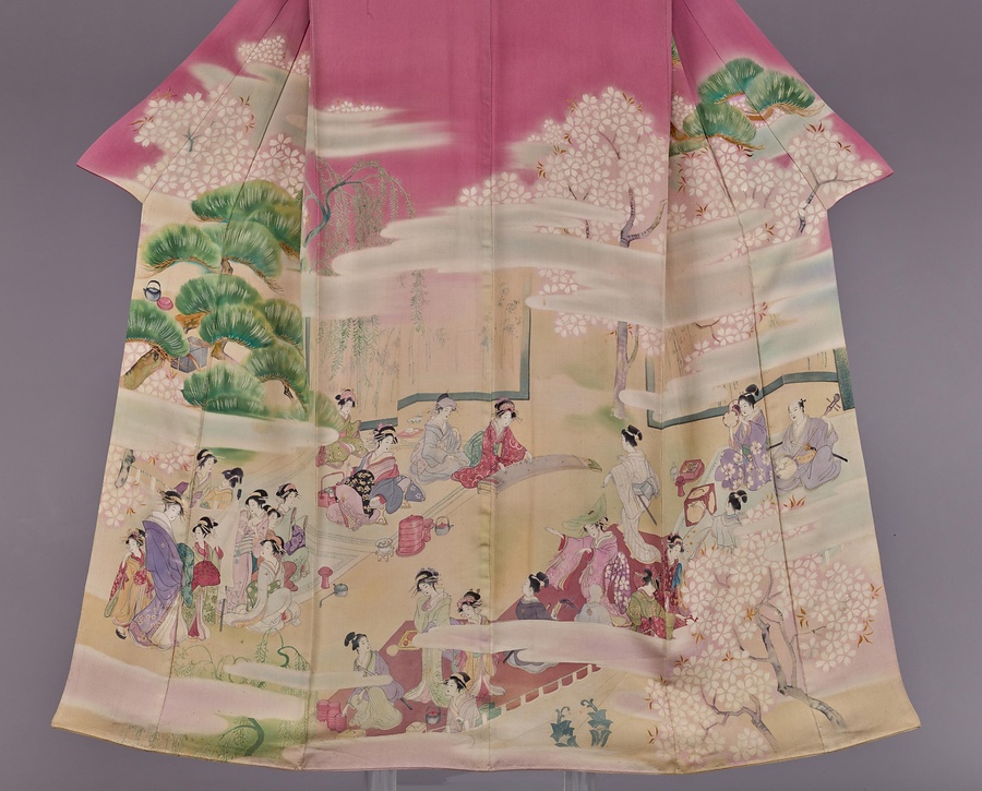 振袖 赤紫色縮緬地観桜遊楽模様
