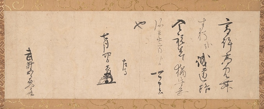 加藤嘉明が伊予の豪族武井五郎右衛門へ宛てた書状で、見舞いとして酢樽二つが遠路贈られてきたことについて、喜びの気持ちを返した礼状。もとは、当館保管の「武井家文書」に含まれていたもの。武井家は、戦国時代に武任姓を名乗って河野氏に従い、四国平定後には次々に入部した大名に仕えた武井宗意(貞通)の活動が知られ、江戸時代中期には松山藩御用絵師武井周発(常美)を輩出している。武井五郎右衛門は宗意の子で、嘉明との懇意な関係を維持し、嘉明が会津へ転封した後には長年の奉公への謝意や礼物が贈られるなど、厚い信頼を得ていた。嘉明が伊予支配の中で築いた在地勢力との関係の一例である。本書状は、嘉明の署名・花押から江戸時代初期の慶長年間終盤以降のに比定できる。簡潔な内容の贈答礼状のため、目的や背景など詳細ははっきりしないが、中・近世移行期の伊予支配の一端をうかがわせる1通である。