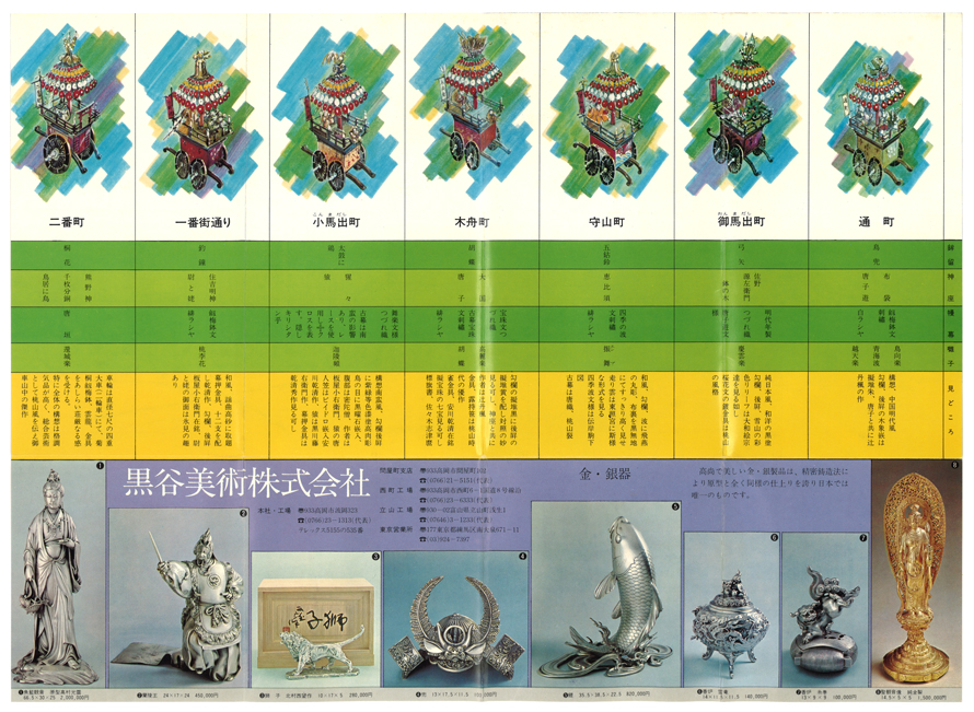 本資料を広げると、表紙と同じ面に「御車山祭奉曳順路略図」「御車山の由来」「高岡御車山工人略伝」があり、反対の面には各町の御車山のイラストと鉾留・神座・幔幕・囃子・見どころが記され、黒谷美術株式会社の金・銀器商品の紹介も掲載されている。