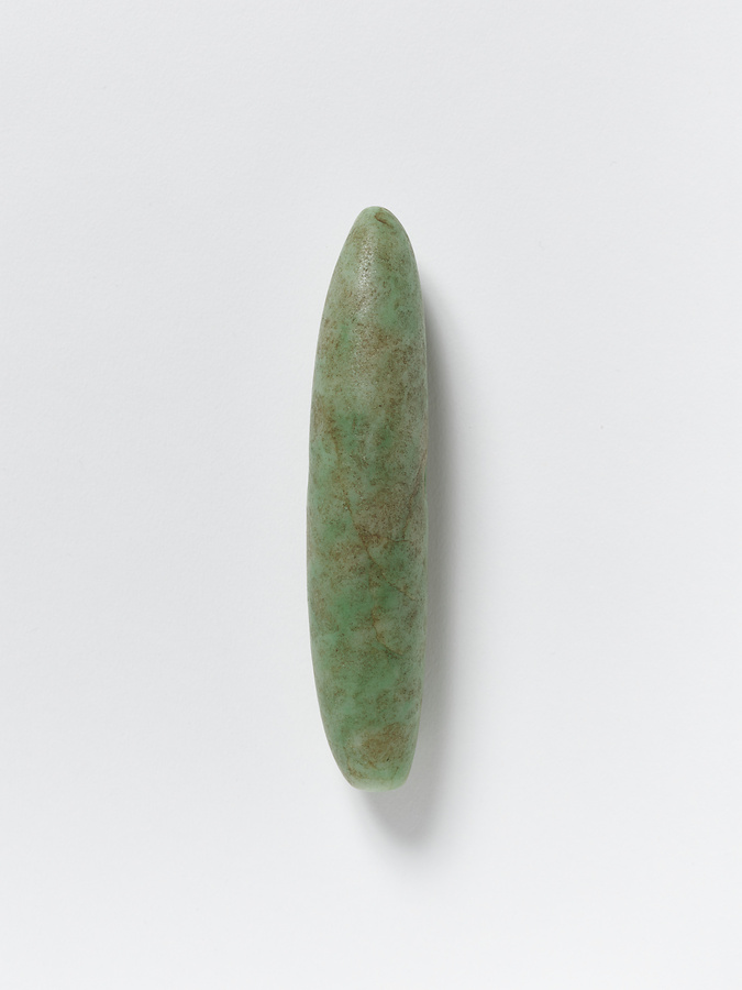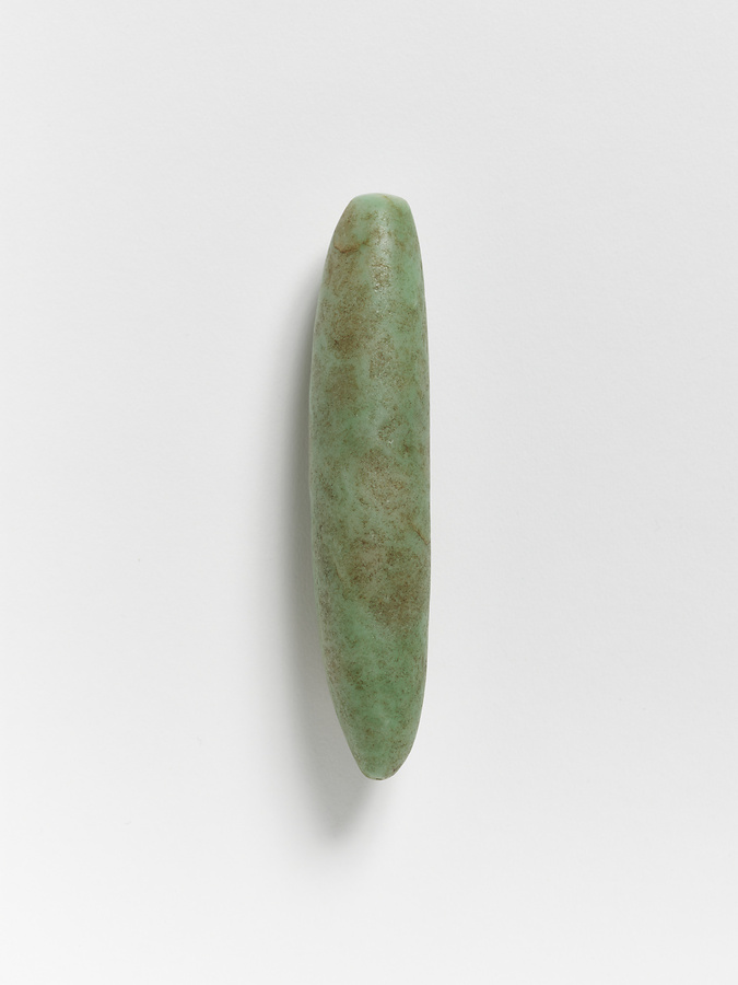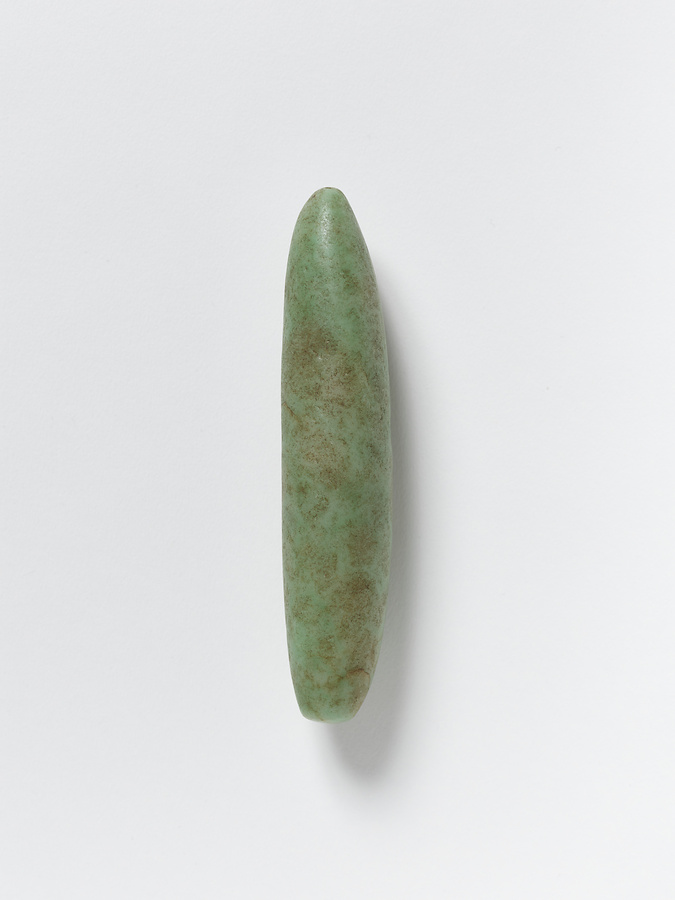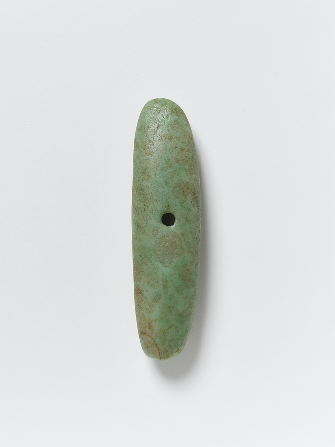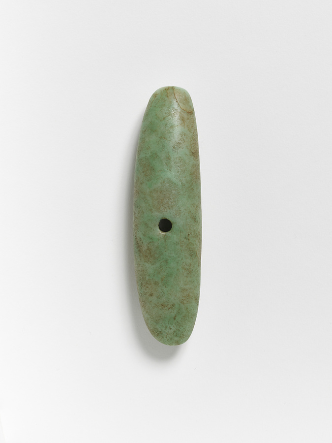 縄文時代後半期には、緑色石材製の垂飾が流行した。大珠はその一例で、中期の東日本で発達し、後期には西日本へと伝わった。本品のような翡翠製のものは、特に東日本で特徴的に見られるものである。九州の大珠は形態的には東日本のものに類似するものの、石材は緑色や白色の翡翠に似た地元の石材が選択された。各地で展開する大珠から、縄文時代の地域性や交流を知ることができる。
