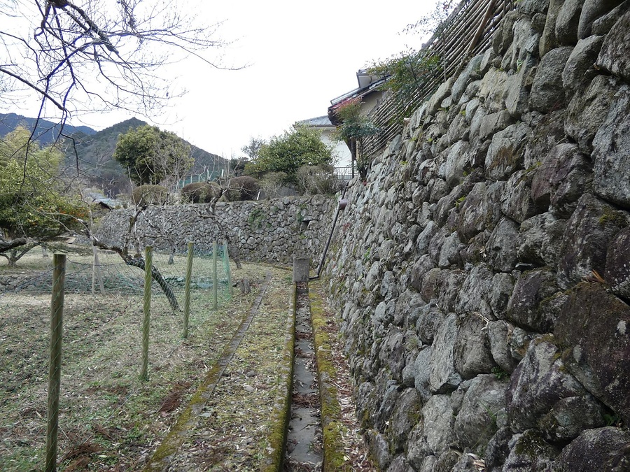敷地北面を折れ曲がり区画する延長51メートル、高さ5メートルの石垣。大きさが不均一な自然石の平滑面を外方に向けて空積で積上げ、最上部に平らな石を積み、かつて塀を建てた。長大な石垣が旧家の風格ある屋敷構えを整え、吉野らしい農村景観を形成する。