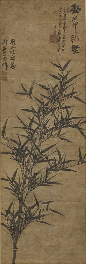 顧安は蘇州@そしゅう@(江蘇省)の墨竹画家。竹は、冬でも緑を保つことから高潔な精神の象徴として中国文人に愛されてきました。本作は「勁節@けいせつ@は弥堅@やがた@し(強い節は非常にしっかりとしている)」と題されて謝子善@しゃしぜん@なる人物に贈られたもの。