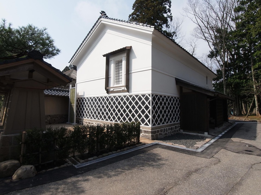 土蔵造、桁行12.7m、梁間7.3m、二階建、切妻造、東面庇附属、桟瓦葺