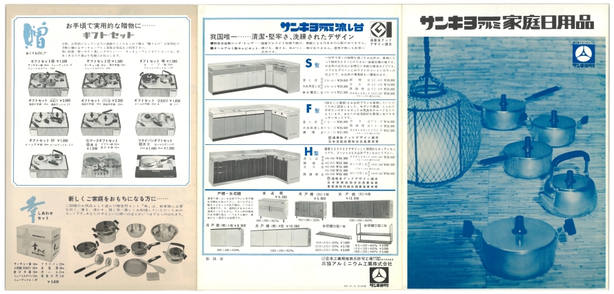 アルミ製の鍋やバケツなどの日用品、台所用の流し台や調理台、食品棚などが掲載された三協アルミニウム工業株式会社のカタログ。