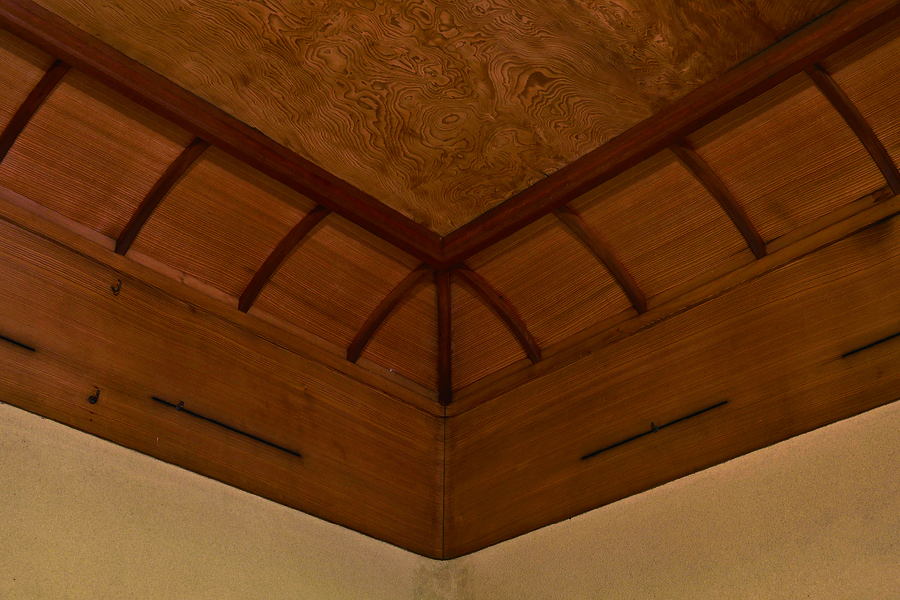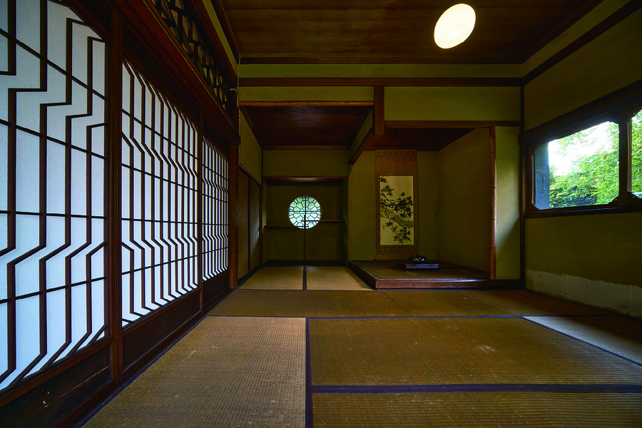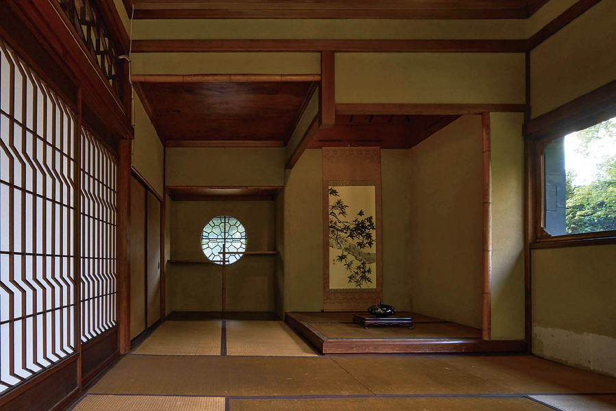 三階応接室の床の間は畳床の残月床で、天井は中央に大きな鏡板を据えた折上格天井となっている。床柱は途中で切られ、相手柱や床脇には竹を用いるなど、数寄的な趣向が見られる。竣工当時の資料には「此処の床は利休好みの二丁床」との記述が残されている。