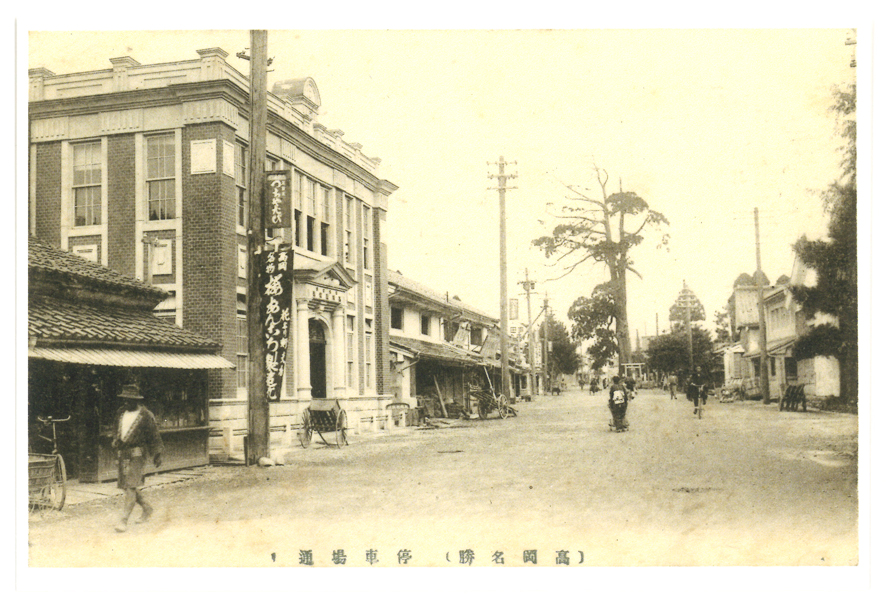 停車場通りは、現在の高岡市末広町(高岡駅前)~高岡市片原横町(国道156号交点)の富山県道23号高岡停車場線。 本資料は片原横町に向かって撮影されている。かつて高岡市末広町通りに立ち、昭和2年(1927)11月18日に伐採された神木・七本杉や、北日本新聞社の前身である高岡新報社(左の洋館。大正10年築)、高岡名物の桜あんころを製造販売していた花より軒ののぼりなどが写っている。