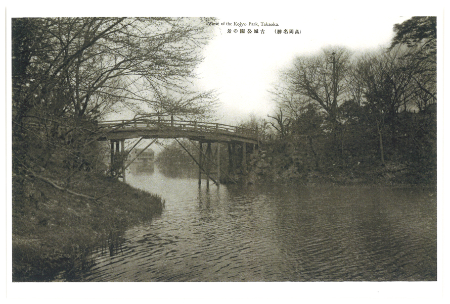 高岡古城公園の朝陽橋を南東から撮影したもの。北東(右)側の橋台に石垣が良く残る。奥に映る建物は、1-05-270-6の絵葉書「(高岡名勝)古城公園より二上山遠望」(昭和8~19年頃)と同一のものである。
