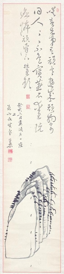 広島藩の儒学者頼杏坪が描き、菅茶山へ贈られた石の図。賛の杏坪の兄で同じく同藩儒学者の頼春水の詩を見ると、画中の石は頑固者が多い頼家の人間を指していることが分かる。