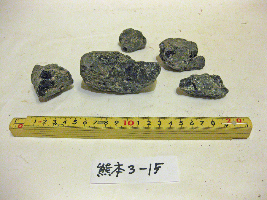 大分県から熊本県にかけて活動した豊肥火山群の1つで、山甲川にそって流れた流紋岩です。黒曜石を含んでいます。