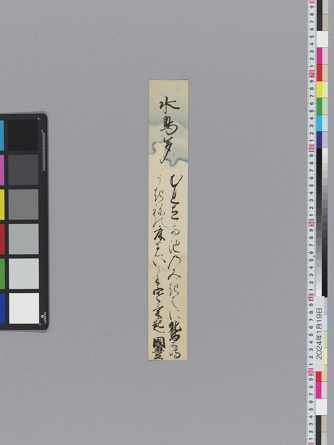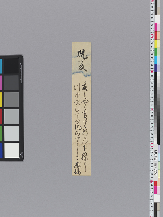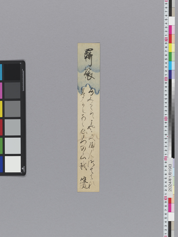 本品の霊元天皇短冊の和歌は、延宝4年(1676)8月24日の月次和歌御会での和歌であることが他の史料からわかるものの、17世紀の御会和歌書留集(『近代和歌御会集』(宮内庁書陵部蔵)や『近代御会和歌』(国立公文書館蔵)、『近代御会和歌集』(国立公文書館蔵))には、この御会について記載がなく、参加者数や詠まれた和歌については不明である。
