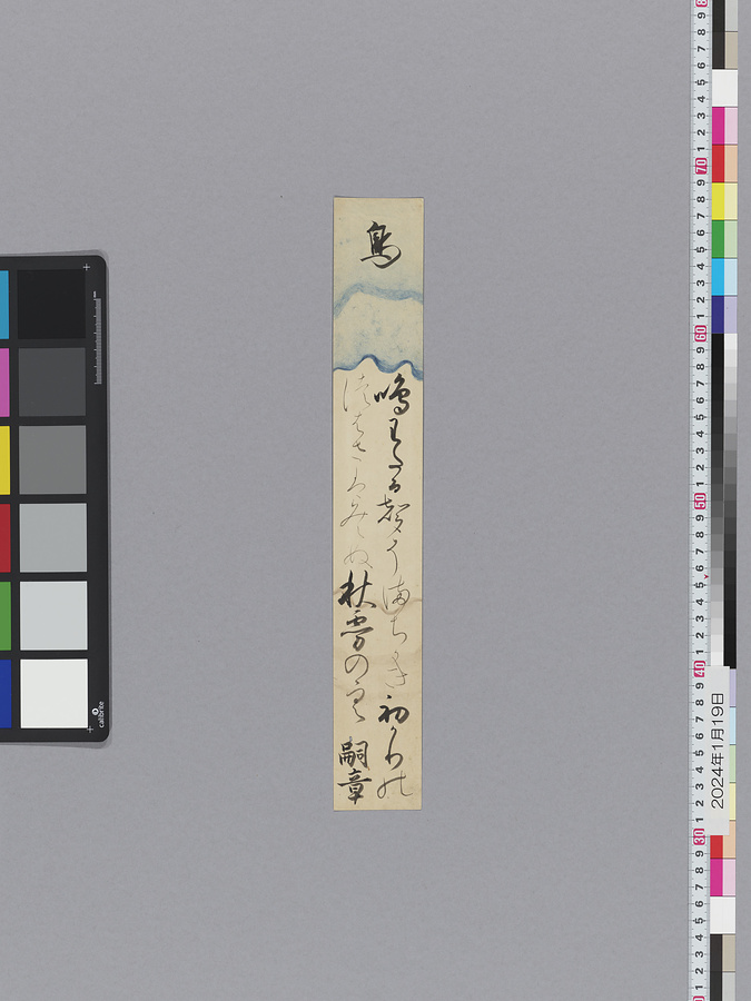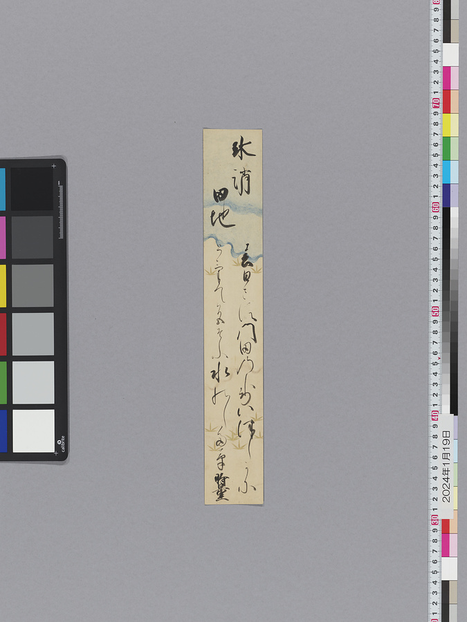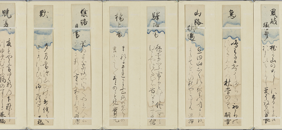 霊元天皇以下、計17名の和歌短冊。霊元天皇(1654-1732、在位1663-87)は、有職故実に通じ、文芸の才能に恵まれ、特に歌道に造詣が深く、生涯に詠んだ歌は6千首を超えるともいわれる。父・後水尾天皇や兄・後西天皇の穏やかな書風とは異なり、霊元天皇の書風は力強さと大らかさが特徴である。霊元天皇の書流は、第17皇子・職仁(よりひと)親王(有栖川宮)へと伝授され、有栖川流として現在まで継承されている。