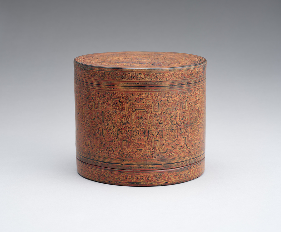 ミャンマーにおいて漆器は「ユン(yun)」と総称され、人びとの日々の生活や仏教などの宗教行事、建築空間における装飾などミャンマー社会に深く根付きながら多種多様に発展してきた工芸である。当地で作られる漆器の素地は、竹をはじめ木、馬毛、金属、布など様々であり、加飾技法も蒟醤や箔絵、下地盛り上げ、ガラス象嵌、漆絵、変わり塗、卵殻など多岐にわたる。主な漆工芸の産地としては、マンダレー管区のマンダレー市内のほかバガンやインワ、ザガイン管区のチャウッカ、シャン州のチャイントンやインレー湖周辺などがよく知られている。技法・意匠とも産地ごとに個性がみられるが、本品は器種・加飾技法ともにミャンマーの漆器産地で共通するキンマ保管容器として典型的な作例である。